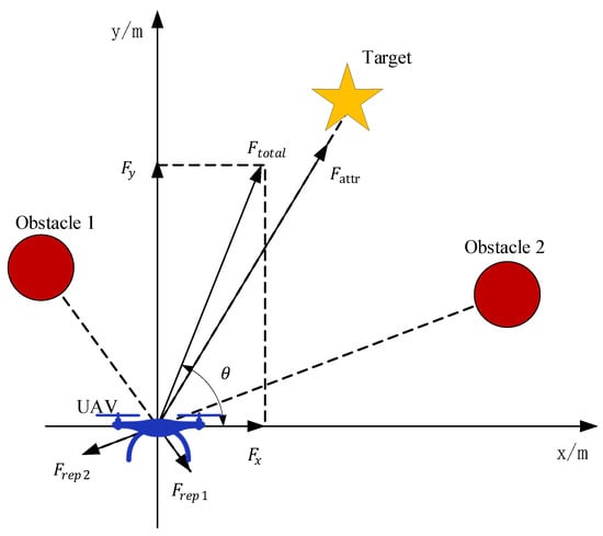 expresses the repulsive force of the obstacle i on the UAV; the combined repulsive force on the UAV is ; and the combined force on the UAV is expressed as