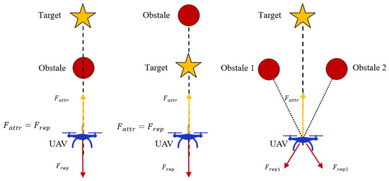 Figure 3 shows three common local minima cases. First, when the UAV, obstacle, and target point are collinear and the target point is at the rear and the obstacle is at the front, the magnitudes of gravitational force and repulsive force are the same and the directions are opposite, causing the UAV to fall into a local minimum and oscillate back and forth. Second, the situation is the opposite; that is, the obstacle is at the rear and the target point is at the front. Third, when the UAV faces multiple obstacles, the repulsive force and gravitational force received by the UAV are of the same magnitude and opposite directions.