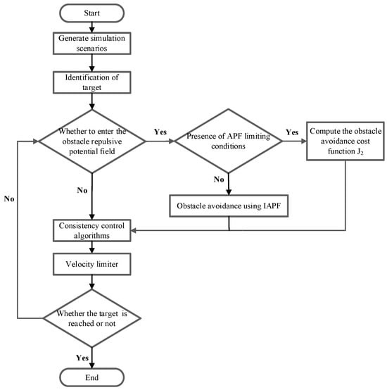 According to design principle of optimal consensus controller based on IAPF, the multi-UAV formation obstacle avoidance control flow is shown in Figure 5.