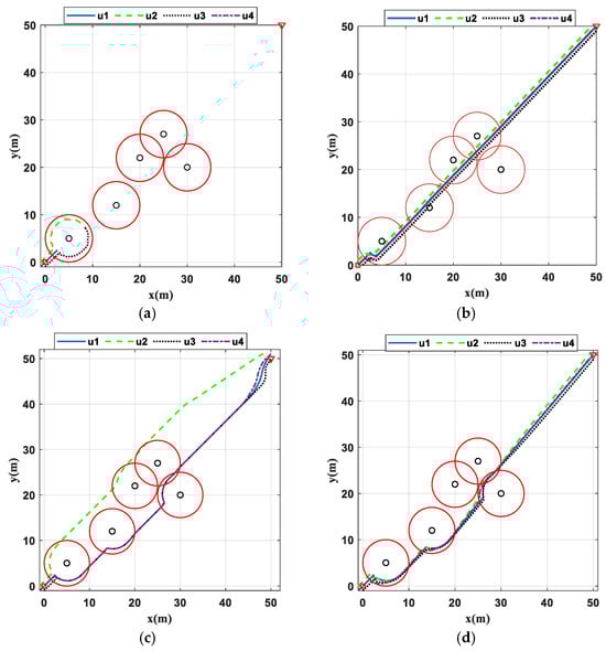 By Figure 14, it can be seen that Figure 14a shows the multi-UAV formation path map formed by the optimal weight parameter combinations selected based on the evaluation function scores using the hyper-parameter optimizer model in the optimal consensus control based on IAPF in unknown environments; Figure 14b shows the multi-UAV formation path map formed by the optimal weight parameter combinations selected based on the Hamilton–Jacobi–Bellman equations and the Lyapunov function in known environments. The two paths are basically similar, both can solve the limitation problem of APF, and the optimal parameter combination selected by using the hyperparameter optimizer model takes 17.32 s for the task, which reduces the task time by 0.16 s compared to the latter. This fully verifies that in unknown environments, the optimal consensus parameter combination determined based on RSHO is extremely close to the optimal solution and can effectively select the best path.