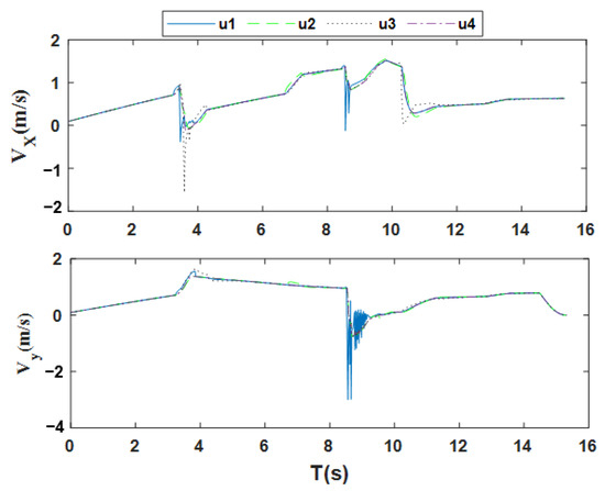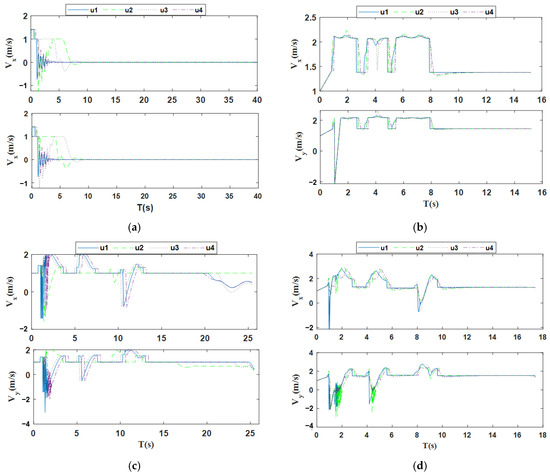 As can be clearly seen from Figure 12, during the obstacle avoidance process in unknown environments, the maximum velocity in all directions does not exceed the constraint range of a maximum velocity of 3 m/s. The velocity of all UAVs are in a consensus state most of the time. And after the formation is disrupted due to obstacle avoidance, it can be quickly adjusted and achieve reconstruction and convergence. This fully verifies that the parameter combination selected by the RSHO can ensure, to a large extent, that the multi-UAV formation is always in a consensus state during flight. At the same time, this parameter combination enables the formation to be adjusted in real time and quickly, thereby enhancing the stability of the formation.