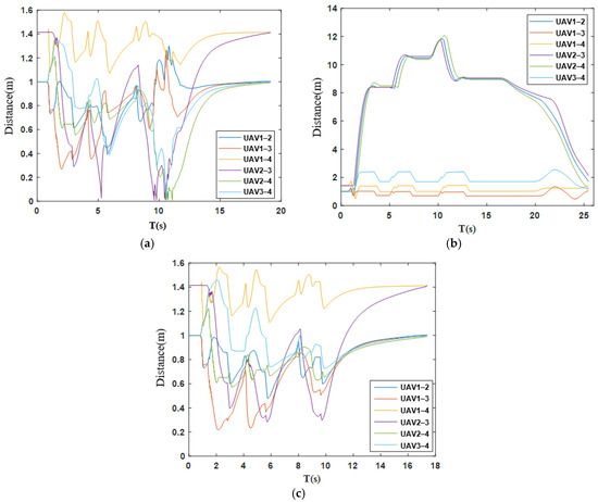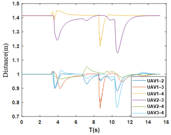 As can be clearly seen from Figure 13, during the entire obstacle avoidance process, the distance between each UAV is always greater than zero. This verifies that there is no collision between UAVs during the task execution. Among them, the maximum distance between UAVs is 1.46 m, the minimum distance is 0.76 m, and the maximum change in distance is only 0.24 m. This phenomenon fully reflects that the optimal consensus parameter combination selected based on RSHO can make the formation of multi-UAV formation have strong integrity during the obstacle avoidance process. This integrity reduces the losses caused by formation reconstruction. It further proves that the optimal consensus control based on IAPF still has the powerful ability to maintain the integrity of the formation of multi-UAV formation during the obstacle avoidance process of multi-UAV formation in unknown environments.