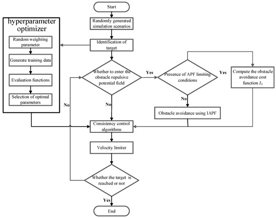 By setting the size of the coefficients in the evaluation function, the preference of task time and queue completeness can be selected according to the task requirements to achieve the optimal combination of parameters to meet the task requirements. In actual flight situations, when the mission time is urgent, for example in emergency rescue missions, time is a crucial factor, and it is necessary to reach the target location as quickly as possible. In this case, the weight proportion of the mission time coefficient can be increased, and the evaluation function will give priority to the weight parameter combinations that can shorten the mission completion time. When the mission time is relatively not so urgent and there is a need to maintain the formation and adjust the flight trajectory in real time, the coefficient of the multi-UAV formation integrity can be increased. Then, the evaluation function will give priority to the weight parameter combinations with high formation integrity and fast convergence velocity, which helps to enhance the stability and robustness of the formation. Figure 10 shows the flowchart of the optimal consensus controller for improving APF in unknown environments.
