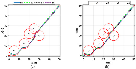 Multi-UAV formation path map. (a) The optimal consensus control based on IAPF in unknown environments; (b) the optimal consensus control based on IAPF in known environments.