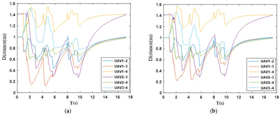 Inter-UAV spacing. (a) The optimal consensus control based on IAPF in unknown environments; (b) the optimal consensus control based on IAPF in known environments.
