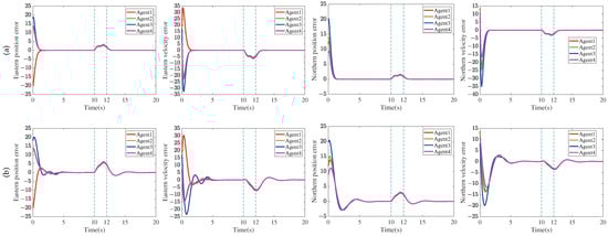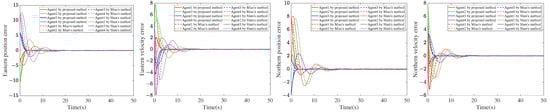 (3) Finally, unlike the analysis method proposed in [,] to calculate the maximum allowable communication delays, which is less than 0.14 s, our proposed protocol and analysis approach can be tolerant of more than 1.20 s, which means that our method is more versatile and adaptable for a wider range of scenarios. In addition, we address the TVF trajectory tracking problem under the multi-coupling constraints of MASs.