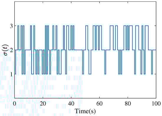 In this paper, we utilize the semi-Markov process to model the switching communication topologies. Its finite state space is and initial state is . Furthermore, the communication topologies of the MAS (2) are constructed as , as depicted in Figure 5, where the numbers 1 to 6 in the figure represent the 1st to 6th agents. According to Remark 4, the transition rate matrix is chosen such that , , , , , . Figure 6 reflects the topologies switching of the semi-Markov stochastic process from s to s.