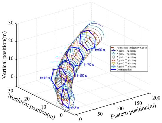 By implementing the above controller gains into the error system, Figure 7, Figure 8 and Figure 9 depict the trajectory tracking 3D diagram, the trajectories on eastern, northern, and vertical position and velocity, and curves of tracking formation performance of an MAS with multi-coupling problems, respectively. From Figure 7 and Figure 8, we can draw the following conclusions: (1) The formation configuration composed of six agents is a regular hexagon, and the trajectory center can be tracked accurately. (2) Under nonzero initial conditions, the actual formation center of the MAS in the eastern, northern, and vertical directions can converge to the expected formation center within s. In addition, the severe external disturbances from s to s can be well suppressed by the proposed controller to ensure that TVF is maintained. Figure 9 demonstrates that the proposed method can still make MASs maintain a good tracking formation performance even under the influence of stochastic switching topologies. In summary, although the system will be affected by multi-coupling constraints simultaneously, the controller designed by the method proposed in this paper can effectively suppress these hybrid problems, so as to achieve the control objective of TVF trajectory tracking. Thus the validity of Theorem 3 is demonstrated. It is worth noting that, compared with the existing research in the field of TVF, we consider the above five coupling problems in Table 1 for the first time in Example 3.