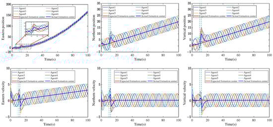 where signify the eastern, northern, and vertical position and eastern, northern, and vertical velocity of the ith agent, respectively. The initial state is set to , , , , , . .