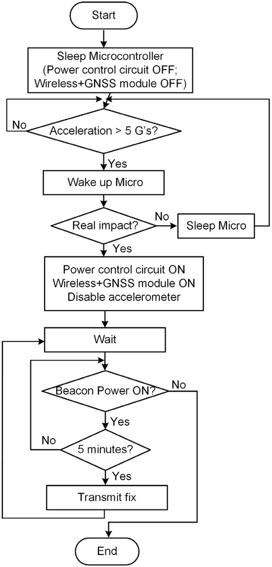 - In the event of a crash or abrupt landing, the accelerometer detects the impact. If it senses an acceleration of more than five Gs, it sends an interrupt signal to wake up the microcontroller, which then verifies if this acceleration indicates a genuine impact. If confirmed, the radio beacon activates to transmit its location; otherwise, the microcontroller returns to sleep mode to save power.