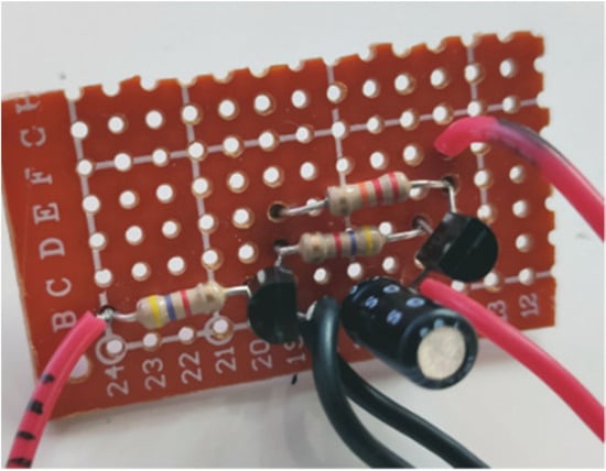 The control circuit is made of two PNP transistors, three resistors, and an electrolytic capacitor. A prototype of it is shown in Figure 3. This circuit is used to connect and disconnect the power supply on the positive side of the load (communication board with SIM868 module), maintaining low power consumption in both the on and off state.