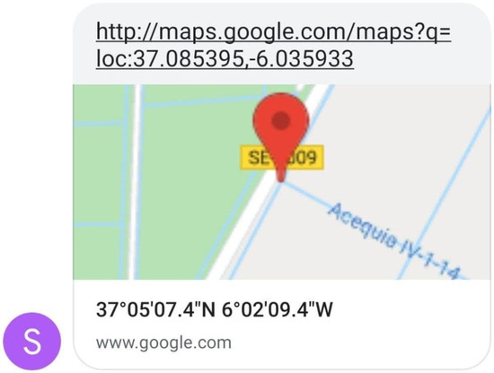 In the developed code, due to the way the SIM868 module returns information, this information is extracted and separated before sending it by text message. In the case of our prototype, only the latitude and longitude will be sent. The aim is to facilitate the work of the operator in charge of finding the beacon by directly sending a link with the coordinates to the Google Maps site. To achieve this, it will be sent in the following way: http://maps.google.com/maps?q=loc:latitude,longitude (accessed on 5 March 2024). The first check is with the radio beacon while at the Higher Technical School of Engineering of Seville (Spain). In this experiment, Google Maps confirmed that these coordinates correspond with the Higher Technical School of Engineering of Seville. To check the location precision, we measured the position with the GNSS receiver in different locations, in both urban and rural environments, obtaining some pairs of coordinates and we obtained our “real” locations pointed out in Google Maps. Then, we calculated the difference in meters between GNSS locations and locations according to the map application. In general, we can say that the results obtained confirm that, in the areas where the considered UAV is going to fly (rural areas, outdoors, far from any great obstacles), the accuracy of the GNSS receiver given by its manufacturer is valid and it is very good.