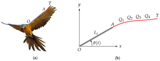The dynamic model consists of a flapping joint at O, which defines the origin of the wing coordinate system. The wing is modeled by two portions: an inner and rigid wing of length attached to the flapping joint, and a flexible outer wing with non-deformed length attached to the other end of the rigid wing. The rigid wing attached to the flapping joint defines a time-dependent flapping angle with respect to the x-direction. This angle is directly controlled, and it prescribes the motion of the wing by considering different flapping strategies. A typical bird and the bio-inspired mechanical model of the FWUAV wing are presented in Figure 1a,b, respectively, where the points of interest of the model are associated with their counterparts on the bird wing.