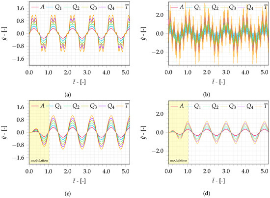 Model 1 (see Table 2) is identical to Model 0 except that the input is modulated. Variations in the normalized vertical position and normalized velocity from points of interest with respect to normalized time are presented in Figure 3c,d, respectively. Note that Model 1 does not show the higher frequency oscillations of Model 0 shown in Figure 3a due to the input modulation. The period in which the flapping is modulated by is represented in Figure 3c,d in the highlighted region. Thus, if the wing is initially at rest, such as during gliding, a smooth transition is required to avoid the vibrations shown by the trajectories of Model 0.