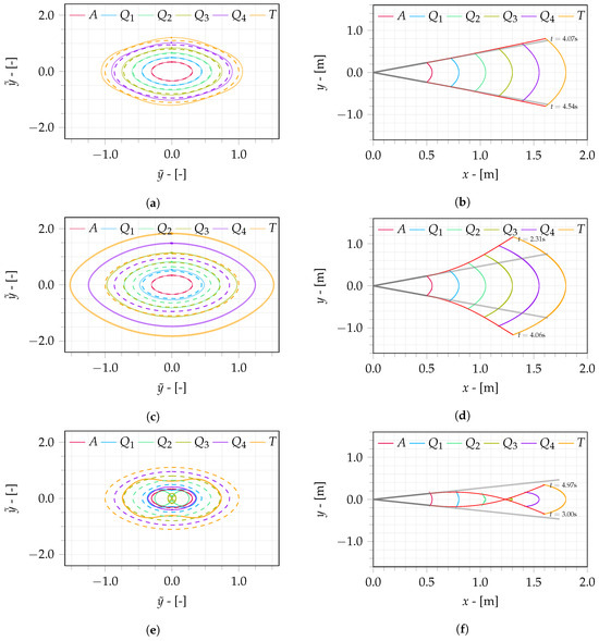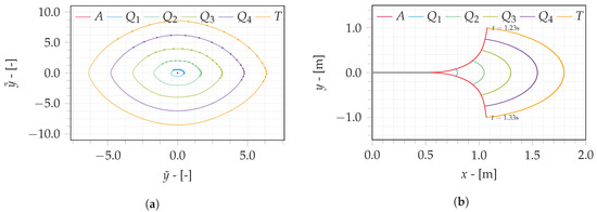 Alternatively, the trajectories of the wing are presented in the phase portrait as illustrated in Figure 4a,c,e. Each orbit illustrates the trajectory of the points of interest after the modulation period. The orbits outlined using dashed lines correspond to the position and velocity of an equivalent point in a rigid wing, computed through kinematics (Equations (1) and (2)). The points illustrated in the phase portrait are intersections of the trajectories with Poincaré sections defined at multiples of the flapping period. The points in these sections represent the mode shape of the wing during the flapping motion.