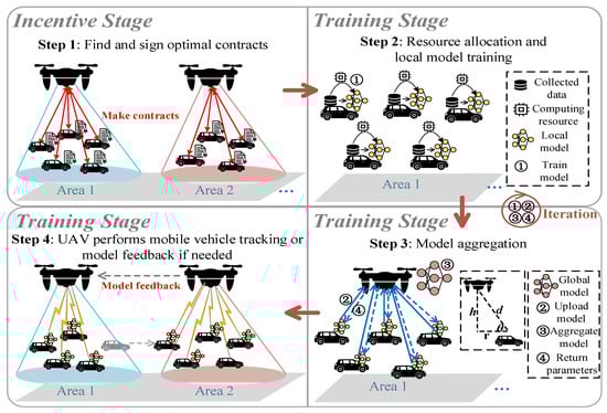 Our proposed UAV-assisted FL framework in the IoV involves an incentive stage and a training stage, as shown in Figure 2.