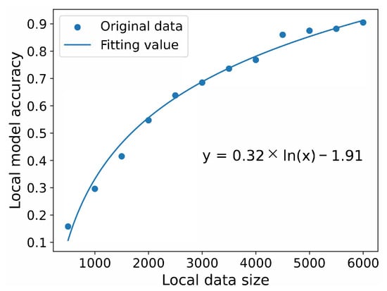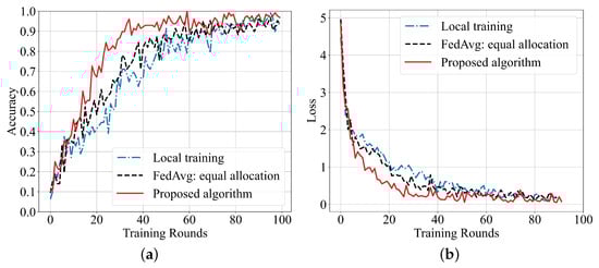 Figure 10 shows the comparison of the proposed algorithm’s accuracy with local training and the classical federated averaging (FedAVG) algorithm with an equal dataset allocation. The results show that the accuracy of the proposed scheme is higher and the convergence speed is faster than other algorithms on the MNIST dataset. This is because the proposed algorithm assigns a training dataset size for VUs, and for the group of datasets, a large number of experimental fitting results are used to calculate the training rounds of each VU. Our algorithm makes up for the insufficient training caused by the small amount of data compared with local training. Compared with classical FedAVG, it also employs FedAvg, but performs data allocation and iteration rounds more accurately, which makes the model’s performance improve faster. The results of the training loss further confirm the better performance of the proposed algorithm.