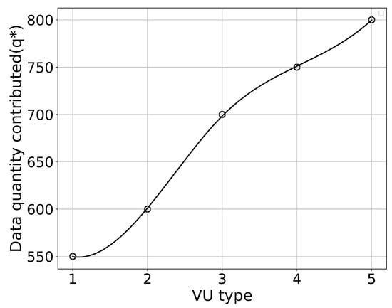 Firstly, a total of 20 VUs and 5 VU types are set up to determine the optimal data quantity and optimal reward based on the contract. We obtained solutions for the optimal data quantity for 5 VU types, which are 550, 600, 700, 750, and 800. The distribution of the 20 VUs in the 5 types is 5, 4, 6, 3, and 2.