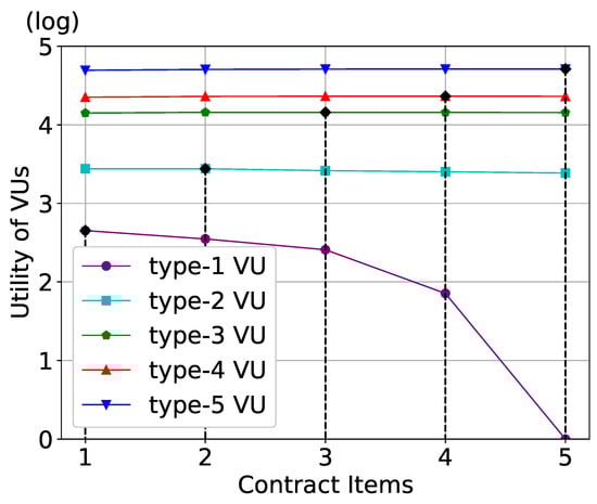 The utility of VUs is shown in Figure 6. We can observe that all types of VUs achieve their maximum utility only when they choose the contract item designed entirely for their type, which explains the IC constraints. In addition, each VU can obtain a non-negative utility when selecting the contract item corresponding to their type, thus validating the IR constraints.