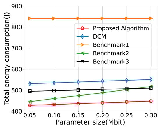 Figure 7 illustrates the relationship between different transmission parameter sizes and energy consumption. It can be observed that, as the parameter size increases, the total energy consumption also increases. This is because larger parameters require more energy for transmission.