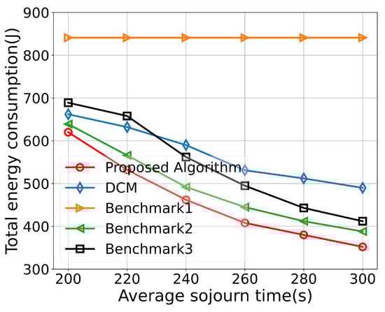 Figure 8 illustrates the relationship between VU’s sojourn time and energy consumption. It can be observed that, as the sojourn time increases, the energy consumption decreases. This is because VUs have a longer training time, leading to a lower allocated CPU frequency and transmission power, resulting in reduced computational and transmission energy consumption. The curve’s trend gradually flattens out as the computation or communication resources reach their minimum values. Among the compared algorithms, Benchmark1 exhibits the least significant decrease in energy consumption. This is because its CPU frequency is set to the maximum value and cannot be reduced. In the DCM algorithm, latency is optimized, which may lead to a trade-off between latency and energy consumption, resulting in higher energy consumption compared to the proposed algorithm in this paper. The proposed algorithm comprehensively considers contract-based sojourn time, computational capacity, and transmission capacity, aiming to minimize the total energy consumption within a given sojourn time requirement.