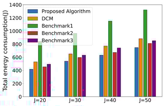 Figure 9 illustrates the relationship between the number of VUs (J) and the total energy consumption in FL. As the number of VUs increases, the energy consumption inevitably increases. For Benchmark1 and Benchmark2, the allocation of maximum CPU frequency and transmission power, respectively, results in high energy consumption. For Benchmark3, the data allocation to VUs is not optimized, resulting in many VUs being assigned the minimum amount of data, which may lead to poor model performance. As the number of VUs increases, the performance gap between the DCM algorithm and the proposed algorithm significantly increases. This is because the DCM algorithm optimizes the total latency and model accuracy and may allocate as much data and as many resources as possible to improve accuracy and reduce latency, but it ignores the consideration of the willingness of VUs. The proposed algorithm outperforms all benchmarks when the number of VUs increases, demonstrating that the designed algorithm achieves good stability.