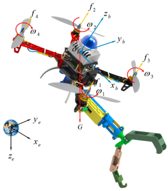 where is the total thrust of the drone; , , and are the displacements, velocities, and accelerations in the z direction in the world coordinate system, respectively; m is the total mass of the drone; g is the acceleration of gravity; l is the drag coefficient; and ΔP is the mechanical hand dynamics term.