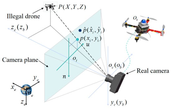 Assuming the illegal drone is a stationary target point P, with the world coordinate and the virtual camera frame, is and , respectively. Their transformation equations can be expressed as