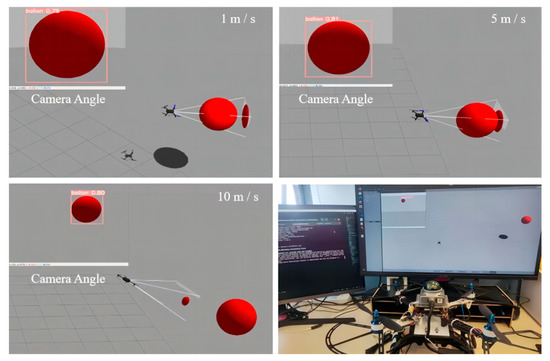 To simulate the states of actual flight, multiple states were set in the HITL simulation experiment, including environment initialization, take-off direction, target search, and tracking. Firstly, relevant scenes were created in the Gazebo 3D dynamic simulation environment, configured with capture objects, and simulated using an RGB camera to emulate a CCD industrial camera. Leveraging the distributed communication of the ROS system, target information was acquired, and the drone state was dynamically adjusted according to the proposed control strategy, reflecting real-time changes in the simulation scene. Finally, the PX 4 was used to control the drone to execute target capture tasks, as depicted in Figure 5 in the simulation scenario.