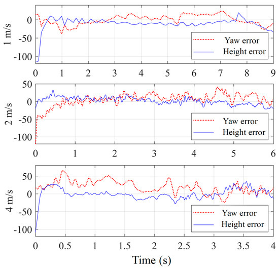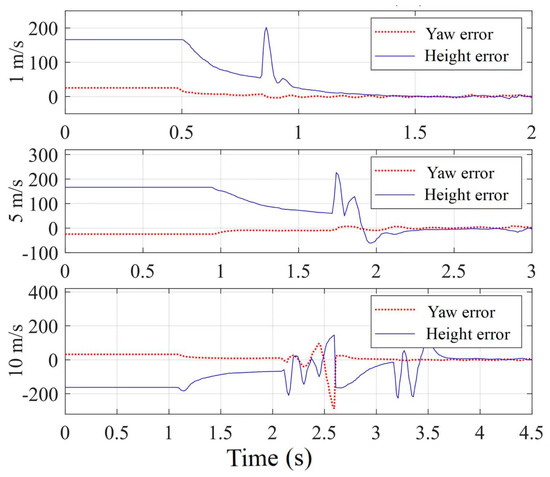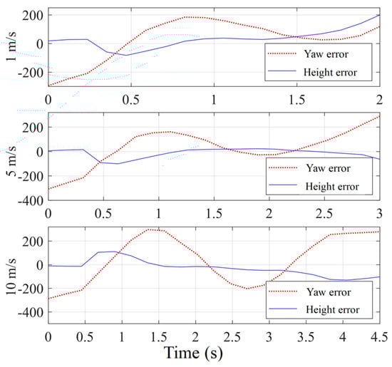To reduce the requirements placed on the graphics card and enhance simulation efficiency, a red ball is used as a substitute for the illegal unmanned aerial vehicle. In the experiment, the red ball undergoes three-dimensional random movement with speeds set at 1 m/s, 5 m/s, and 10 m/s. The counter drone employs the same robust control strategy for tracking and capture. In the absence of EKF prediction, the tracking error in pixel coordinates is shown in Figure 6. When the tracking error is less than 20 pixels, it is considered as successfully tracking the target. In the HITL simulation experiments, the red ball moves at the aforementioned speeds, and the probabilities of the counter drone successfully tracking the target are 100%, 90%, and 12%, respectively. When EKF prediction is applied, the tracking error in pixel coordinates is shown in Figure 7, and the probabilities of the counter drone successfully tracking the target are 100%, 98%, and 80%, respectively. A comparison between Figure 6 and Figure 7 indicates that the use of EKF prediction improves the capture success rate and shortens the capture time. By predicting the future position of the target in advance, the drone can adjust its own state earlier for better target capture. When the red ball moves at a speed of 10 m/s, the counter drone approaches its thrust limit to catch up with the ball, and the pitch angle approaches 70° during acceleration. The HITL simulation results demonstrate that using EKF prediction allows for better target capture. As the target speed increases, both the drone’s flight speed and pitch angle show an increasing trend. Lower speeds result in a more stable capture process. The HITL simulation experiments also validate the robustness of the FNTSM-TDE control strategy.