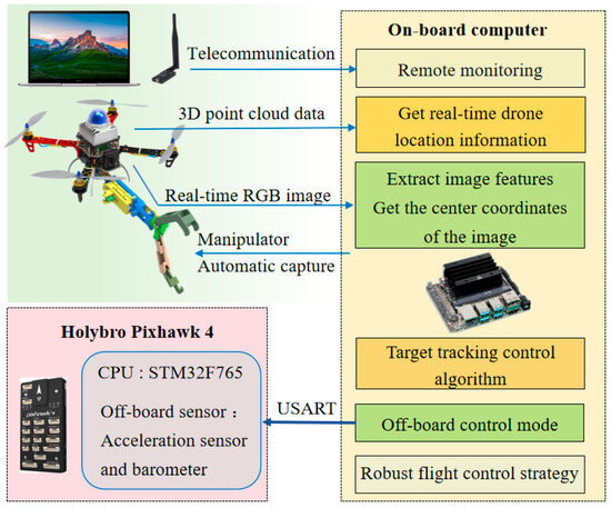 In the actual capture experiment, YOLOv5 technology was employed for target detection. To enhance tracking performance, a dataset comprising 6000 relevant drone images was collected and created. After 2500 iterations, the average Intersection over Union (IOU) on the test set reached 80%. To ensure accuracy and real-time capability, the video stream captured by the camera had a resolution of 1920 × 1080 pixels and a frame rate of 60 FPS. The overall system workflow is illustrated in Figure 9.