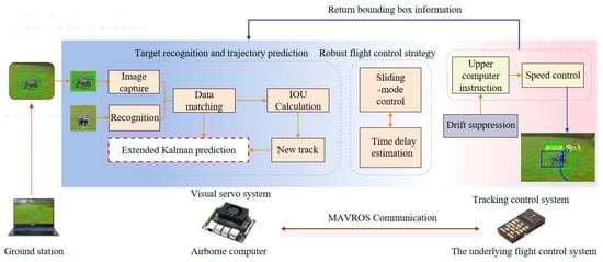 The system diagram in Figure 1 depicts the remote communication between the ground station and the counter drone, which is equipped with an onboard computer featuring autonomous flight capabilities and intelligent perception using a camera to detect the illegal drone. The proposed airspace management strategy incorporates three critical technologies: IBVS, a trajectory prediction module based on the EKF, and a non-linear robust controller.