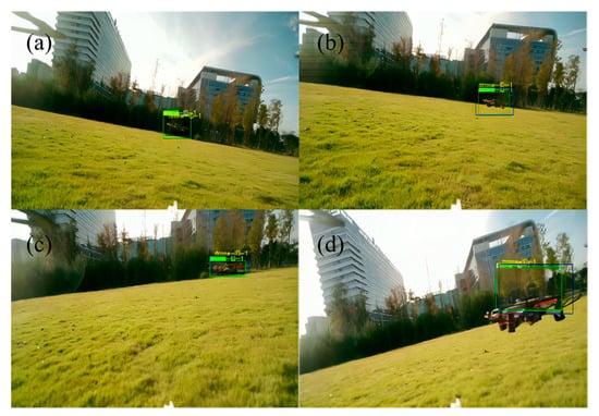 The flight experiment code is identical to the HITL, with the main difference lying in the source of sensor data. In the flight experiment, sensor signals come from the real world, whereas HITL receives sensor signals from the Gazebo 3D dynamic simulation software. In the experiment, the drone initially operates in the position mode, moving to a specified location. The counter drone possesses autonomous search capabilities, rotating around the Z-axis of its body to locate the target and bring the illegal drone into the camera’s field of view. Three capture experiments are conducted with the illegal drone flying at speeds of 1 m/s, 2 m/s, and 4 m/s, respectively. At the beginning of each experiment, the two drones are 8 m apart. Once the counter drone identifies the illegal drone, it autonomously predicts the future trajectory, adjusts its own state in real time, and tracks and captures the target. The capture process from the camera’s perspective is illustrated in Figure 10, where the YOLOv5 algorithm interprets the position of the illegal drone in the camera plane, and the EKF estimates its future trajectory. The four sub images represent the images and recognition effects captured by the drone at different positions and attitude angles, respectively. The pixel error curve during the capture process is shown in Figure 11. Due to the EKF algorithm predicting the trajectory of the illegal drone in advance, the tracking error rapidly converges to zero. In experiments without the EKF algorithm, the convergence time of the tracking error increased by a factor of 2.