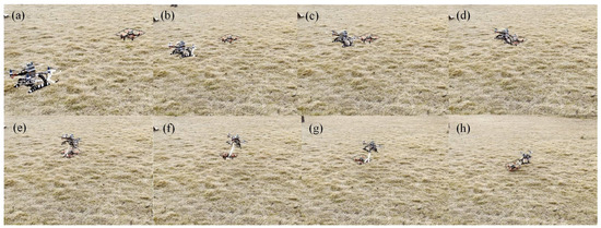 The eight subplots in Figure 12 depict capture scenes of the counter drone, demonstrating its autonomous tracking of the illegal drone and the automatic triggering and capture of the illegal drone by the manipulator. Once the manipulator makes contact with the illegal drone, the elastic elements are automatically triggered, and the claws of the manipulator capture the illegal drone.