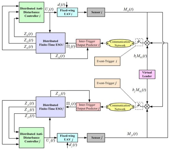 This section aims to put forward an ETM-based ADRC for the consensus control of multiple fixed-wing UAVs. Figure 1 shows the control scheme, consisting of an event-trigger, an inter-trigger output predictor, a distributed finite-time ESO, and a distributed anti-disturbance controller.