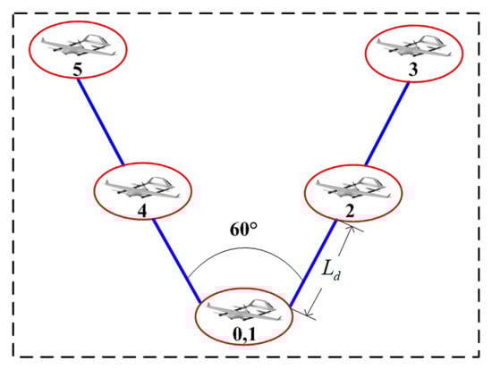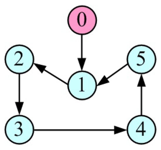 A fixed-wing UAV swarm consisting of five members is employed to verify the performance of the presented control strategy. Figure 2 describes the directed topology of a fixed-wing UAV swarm relative to the virtual leader, where 1–5 stand for five members and 0 represents the virtual leader.