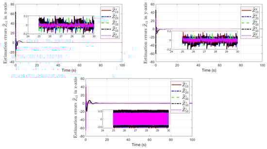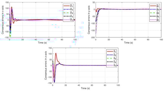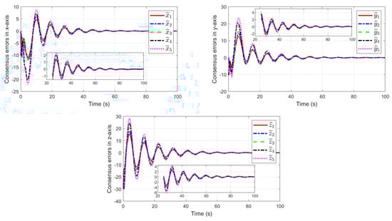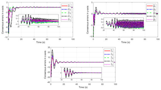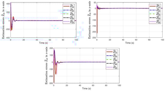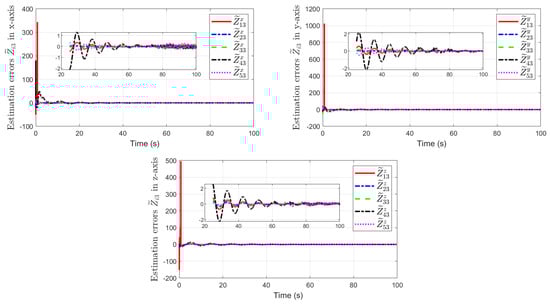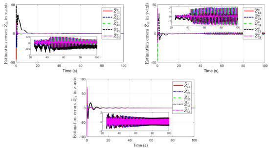 The numerical simulation results are represented in Figure 3 and Figure 4. Specifically, Figure 3 displays the UAV members’ consensus error components relative to the virtual leader. The estimation errors of the total disturbances in the x, y, and z-axis are displayed in Figure 4.