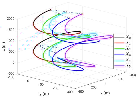 In this subsection, a fixed-wing UAV swarm formation scenario is simulated. The virtual leader’s desired position vectors is m. Figure 9 illustrates the wedge-shaped formation structure of a fixed-wing UAV swarm consisting of five members, whose desired position and velocity vectors are