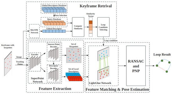 To address the problems mentioned above, this paper proposes a robust and lightweight loop closure detection approach for challenging environments that is based on a state-of-the-art deep learning approach. Building upon the success of the combination of SuperPoint and SuperGlue in the SLAM field, in our proposed approach, SuperPoint is used for the feature extraction component to enhance the robustness of the extracted feature points, and a more lightweight and effective method LightGlue [17] is employed in the feature matching part. For place recognition, we utilize MixVPR [18], which is a method based on multi-layer perceptrons (MLPs) that can more stably represent the global features of images. Furthermore, we deploy the models utilized in our approach using the TensorRT framework to guarantee the real-time performance of loop closure detection.
