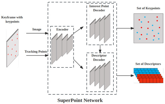The process of feature extraction is shown in Figure 2. Whenever a new keyframe is received, if the image is in color, it is initially converted to grayscale before being processed by the SuperPoint network.