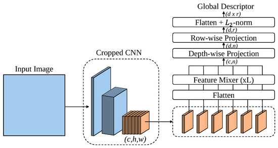 Here, corresponds to the activation map within F, which contains a certain amount of image information. Then, the 2D feature is further reshaped into a 1D representation (flattening), resulting in a flattened feature map , where . Subsequently, these flattened features are input to a set of L MLP blocks (Feature Mixer) with identical structures. It is the fully connected structure that allows the network to have a complete receptive field, enabling it to better focus on the global features of the entire image. After the MLP layers are processed, two mapping operations, depth-wise projection and row-wise projection, are performed to reduce the dimensionality of the obtained global descriptor to . After one more flattening and normalization operation, we finally obtain a dimensional global descriptor with good global feature representation capabilities. The network structure of MixVPR is shown in Figure 3.