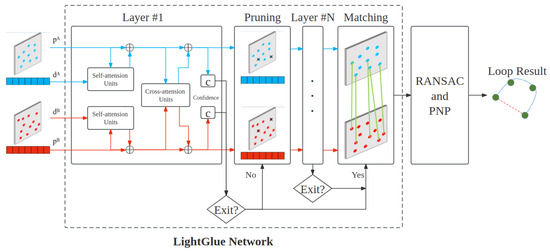 After identifying the best loop closure frame, the next step is to perform local feature matching between the current frame and the loop frame. We design the feature matching and pose computation module of our approach based on LightGlue. Specifically, we first employ LightGlue to process the previously mentioned local features and their descriptors that were extracted by SuperPoint. The procedure for this step is illustrated in Figure 6.