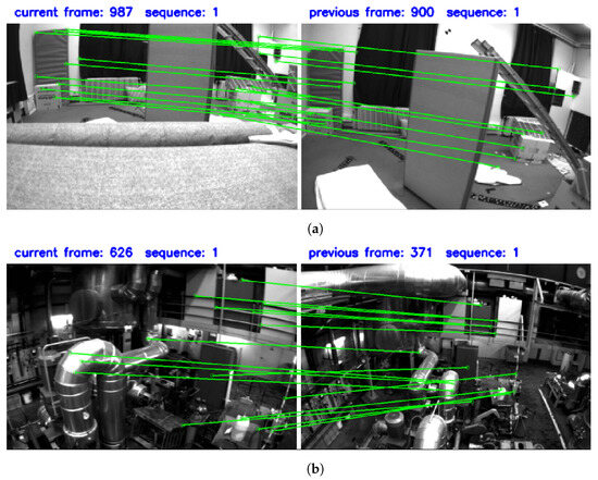 Matching examples from EuRoC dataset. (a) Match pair before and after takeoff. (b) Match pair with large viewpoint changes.