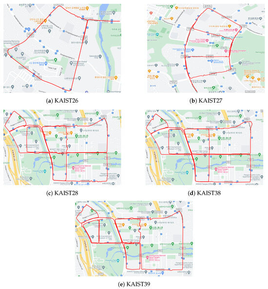 The KAIST urban dataset [44] was collected from highways in South Korean cities using a car driving under normal conditions and provides data from various sensors. The data used for experiments in this section consist of 10 Hz stereo images (with a resolution of 1280 × 560) and 100 Hz IMU data. This dataset is highly challenging for loop closure detection due to its complex environment, including high speeds, long routes, and prolonged durations. We conducted real-world tests of the proposed approach on this dataset and compare it with other approaches. The route diagrams for the sequences used in the experiments are illustrated in Figure 8.