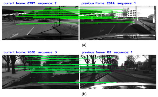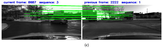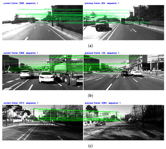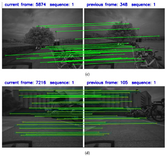 It can be seen that our approach also demonstrates good performance on the KAIST urban dataset. In sequence 26, where loop closure scenarios are infrequent, both VINS-Loop and SP-LOOP fail to detect loops, while our approach can still reliably identify the same place and accurately execute the loop closure. The complexity of the scenes for sequences 27–28 has increased, yet our approach still significantly outperforms VINS-Loop and SP-LOOP. Sequences 38–39 are the most challenging in the KAIST visual-inertial dataset, and while our approach has lower precision than VINS-Loop and SP-LOOP on sequence 38, it still demonstrates good performance on sequence 39. In terms of the average error, our proposed approach’s is much lower compared to VINS-Loop and SP-LOOP, proving its robustness in the presence of numerous dynamic objects interfering with the urban scenes and achieving good results. Figure 9 shows some loop closure scenarios from the KAIST dataset using our approach.