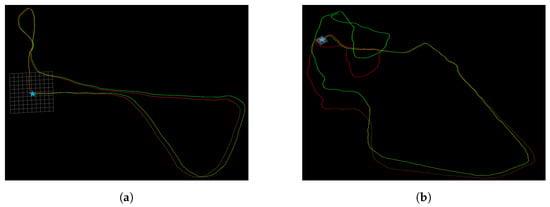 Figure 14 shows the performances for the difficult sequence. In Figure 14a, the trajectory obtained using VINS-Loop shows significant drift from the starting point. In Figure 14b, the trajectory obtained using SP-LOOP shows significant improvement compared to VINS-Loop but still exhibits some drift from the starting point. In Figure 14c, our approach, compared to the previous two algorithms, is capable of returning to the starting point more accurately, demonstrating the best performance.