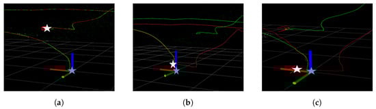 Experimental result of the simple sequence. The green line represents the odometry trajectory, the red line represents the loop closure trajectory, the blue stars indicate the starting points, and the white stars mark the endpoints of the trajectories. (a) VINS-Loop. (b) SP-LOOP. (c) Ours.