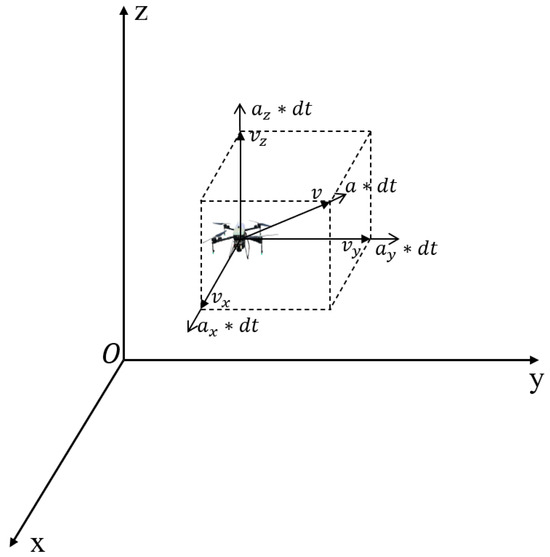 In Equation (1), represent the spatial coordinates of the UAV at time t, where is the coordinate along the x-axis, is the coordinate along the y-axis, and is the coordinate along the z-axis. represent the spatial coordinates of the UAV at time , indicating the new position after a time increment . represent the velocity components of the UAV along the x-axis, y-axis, and z-axis at time t, respectively. represent the acceleration components of the UAV along the x-axis, y-axis, and z-axis at time t, respectively. denotes the time increment, which is the elapsed time from t to . represent the displacement components caused by the accelerations over the time increment . These are derived from the equations of motion for uniformly accelerated linear motion. The kinematic model of UAV is shown in Figure 3.