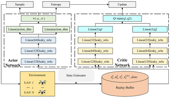 In the actor network, empirical information observations obtained from the interaction between the UAV group and the environment are taken as input. The output of the actor network consists of a mean vector and a standard deviation vector. These vectors are used to determine a Gaussian distribution, representing the strategy . Subsequently, an action is sampled from this distribution.