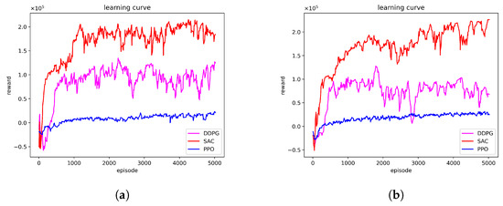 In this article, we utilize three currently mainstream reinforcement learning algorithms (SAC algorithm, DDPG algorithm, and PPO algorithm) to solve the drone swarm rounding-up problem. It should be noted that we ensured that the three algorithm training strategies achieved convergence. Based on the reward function mentioned in the previous article, we measured the rewards obtained by the five drones in each episode and drew a learning curve to evaluate whether the five drones could perform better in the current policy network. During the training process, the fluctuations in the reward function curve were normal. These fluctuations typically arise from the algorithm’s exploratory phase, where various action combinations are attempted; the complexity of the tasks being tackled; the inherent randomness of the environment; and the non-linear nature of the problems being addressed. As shown in Figure 6, the polyline represents the cumulative rewards obtained by the five drones in the current mission space at the end of each episode of training, where (a) is the learning curve of fixed-point rounding-up, and (b) is the learning curve of dynamic rounding-up. As can be seen from Figure 6, under the same important parameter settings, whether it is a static tail scene or a dynamic rounding-up scene, the SAC algorithm can obtain higher rewards than the DDPG algorithm and the PPO algorithm.